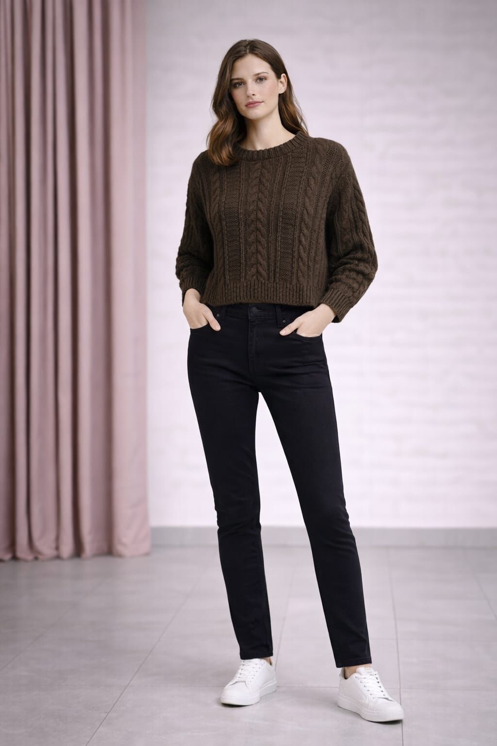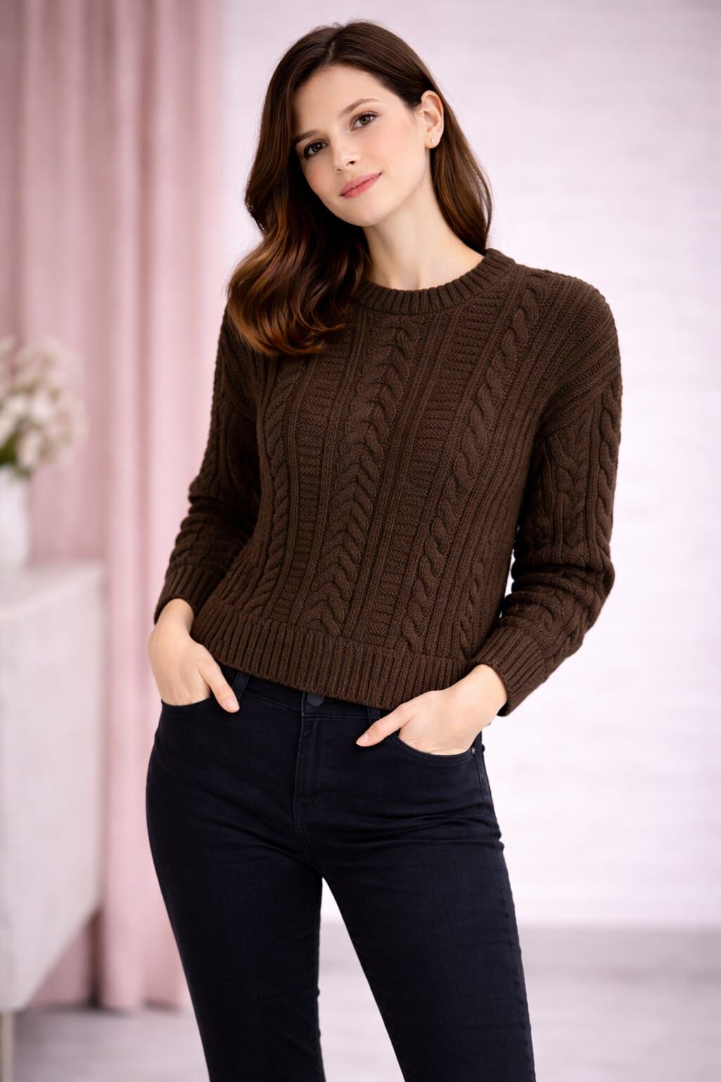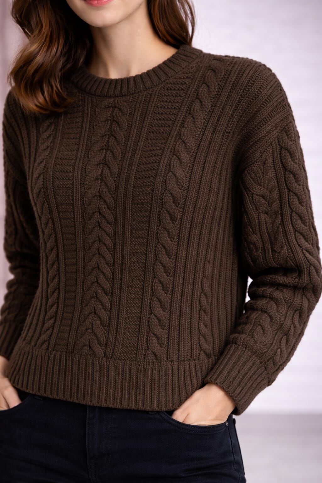 Kahverengi Örgü Desenli Triko Kazak