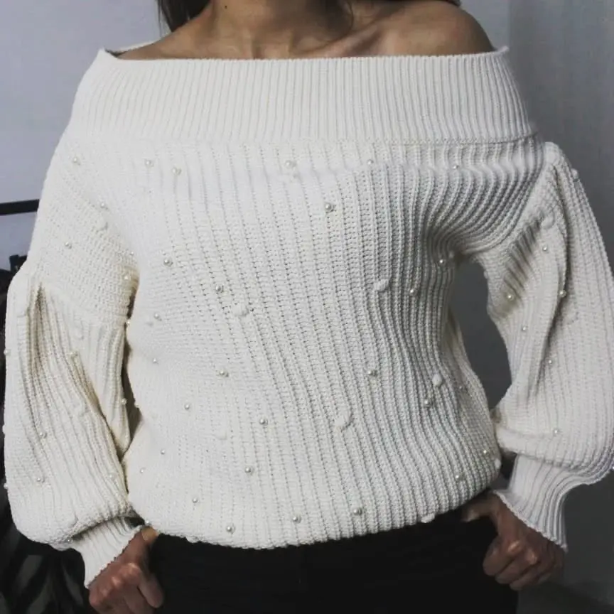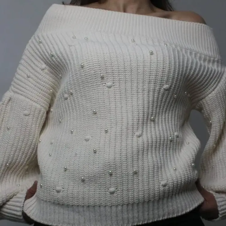 Krem Rengi İncili Omzu Açık Kazak