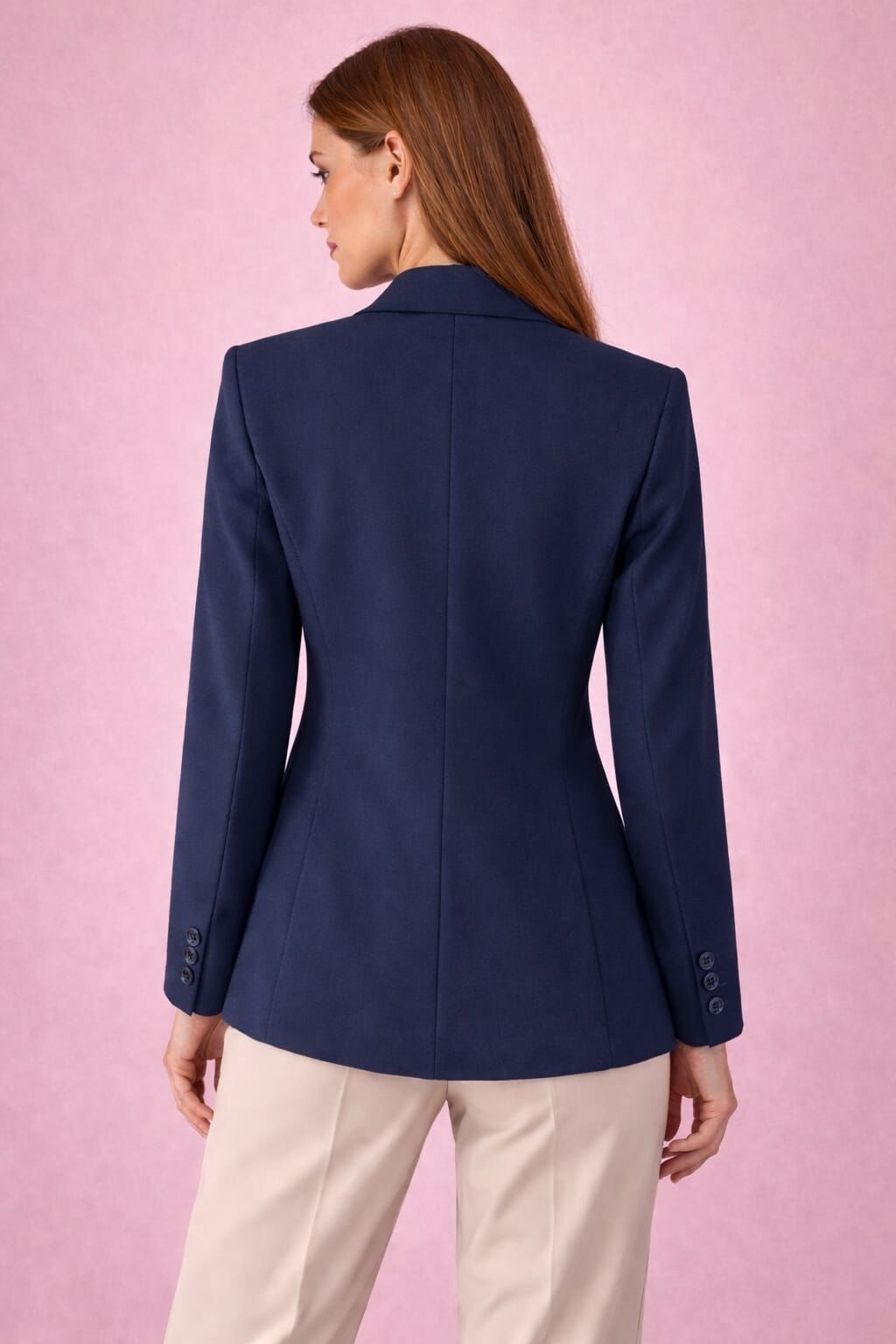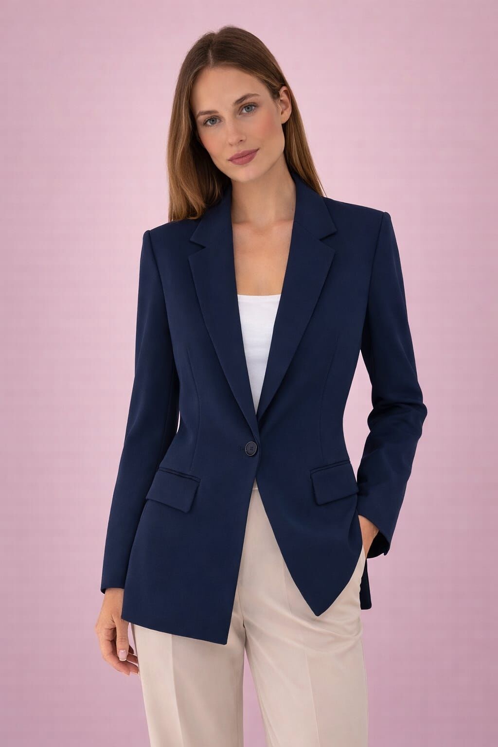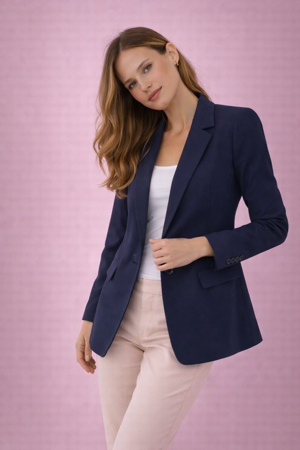 Ön kısmındaki minimal düğme detayı, blazerın sade şıklığını tamamlayan modern bir dokunuş sunar.