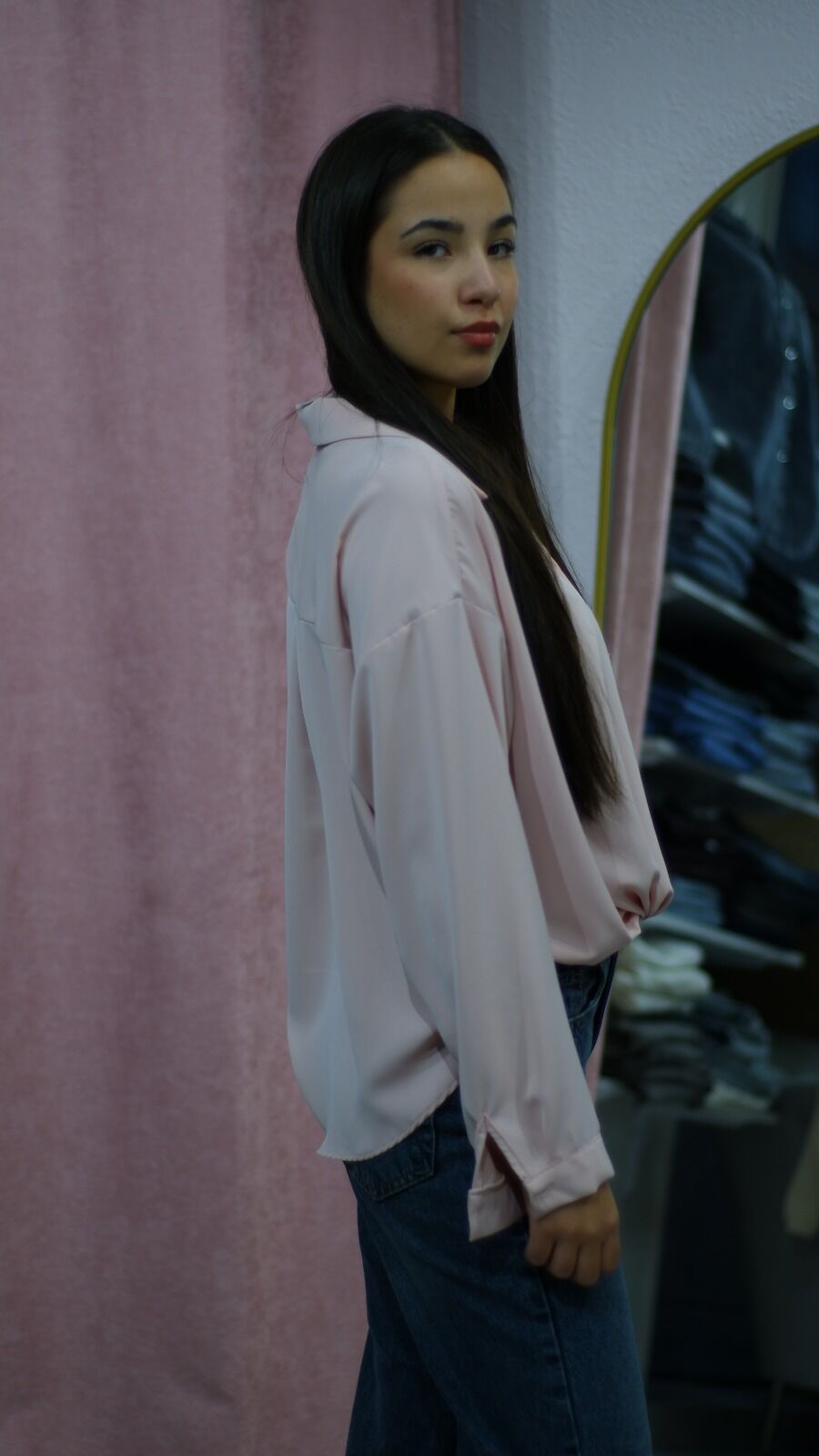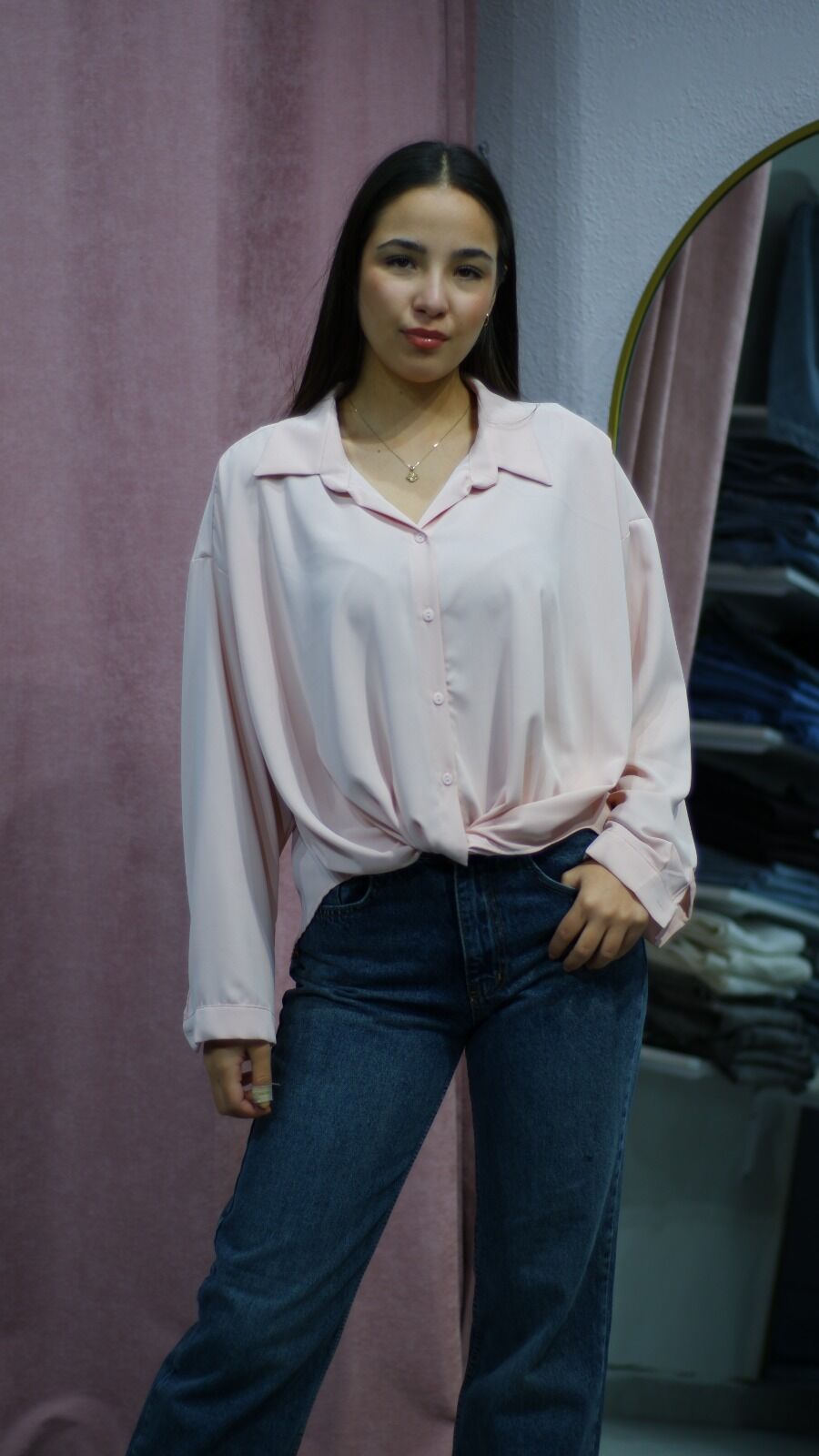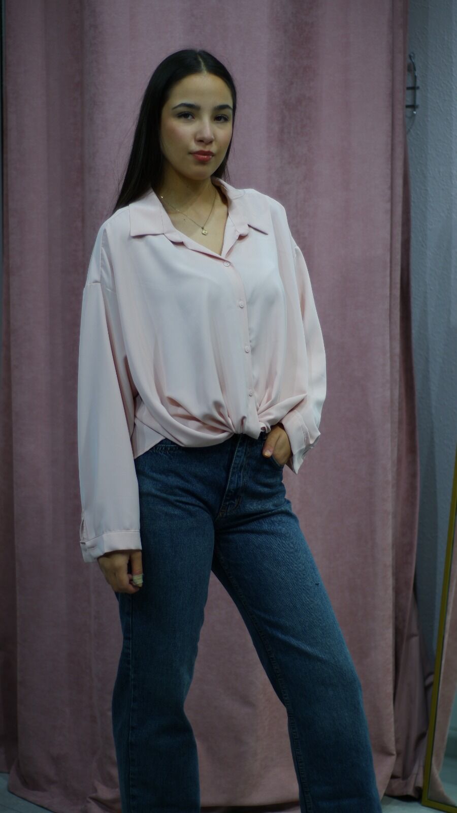 Bağ Detaylı Pudra Pembe Saten Gömlek