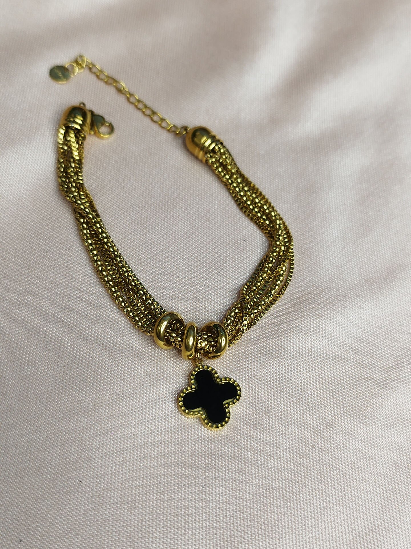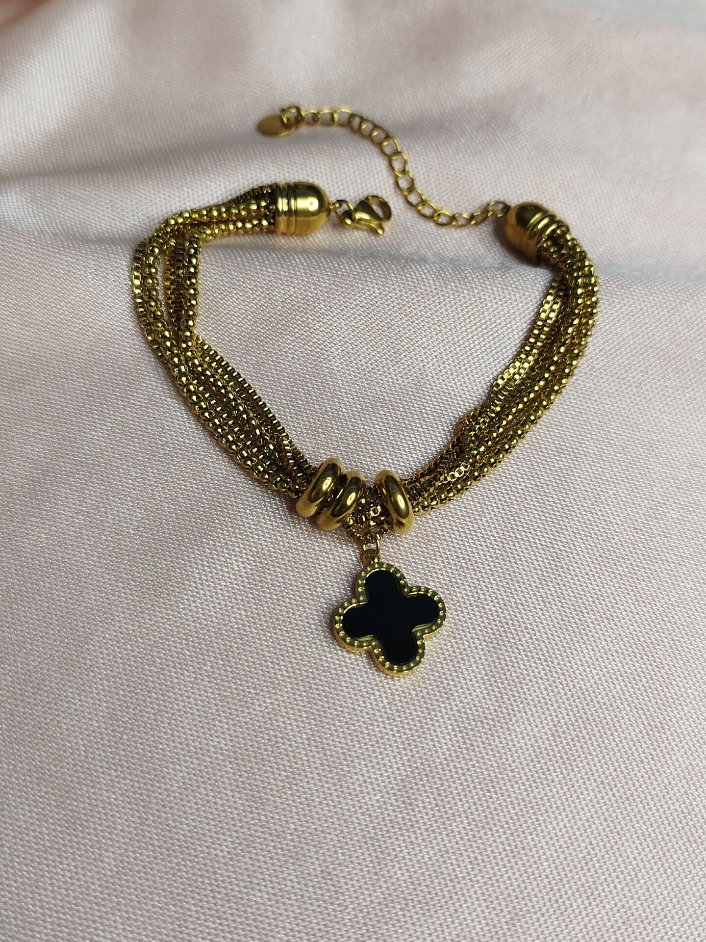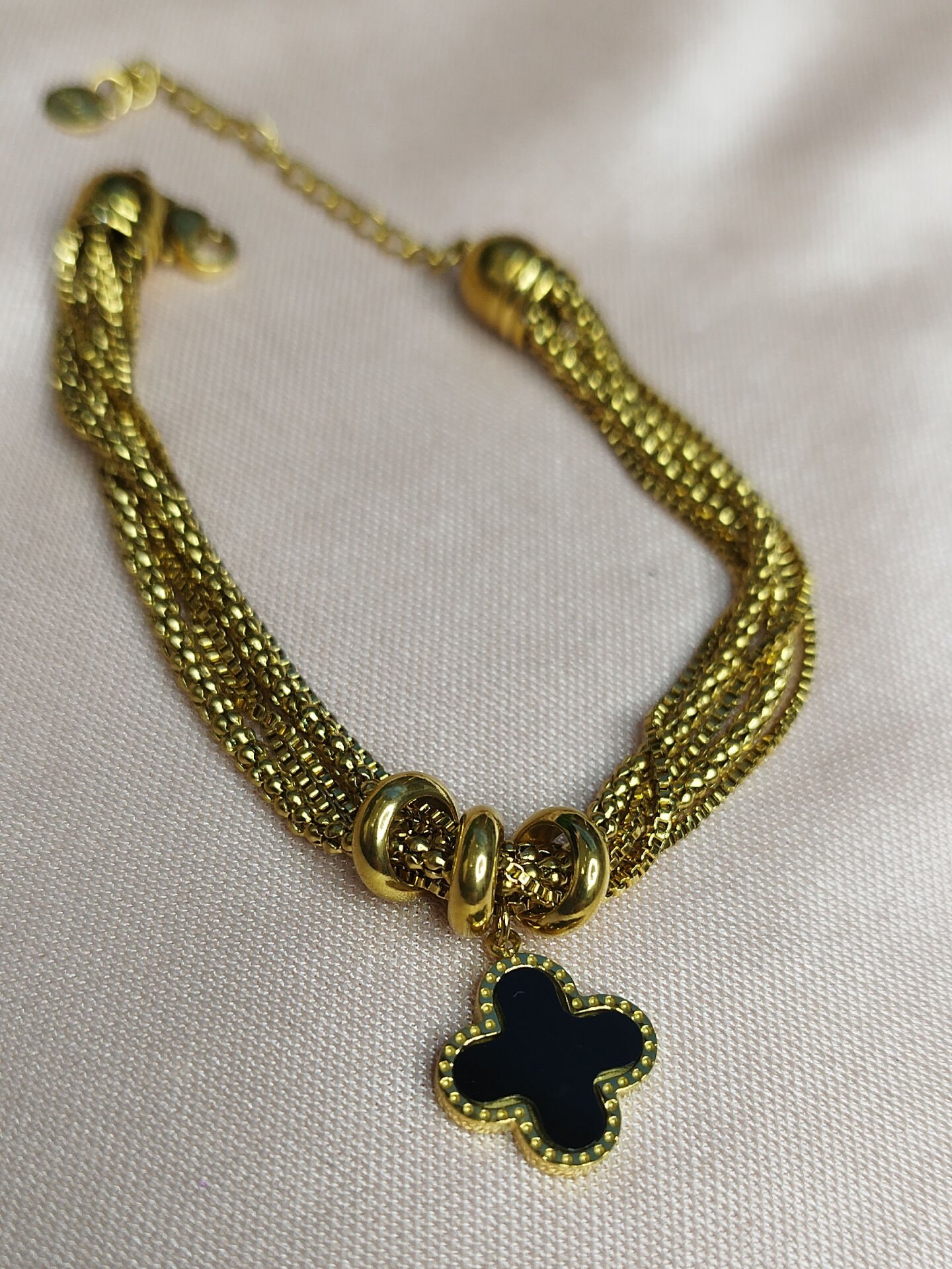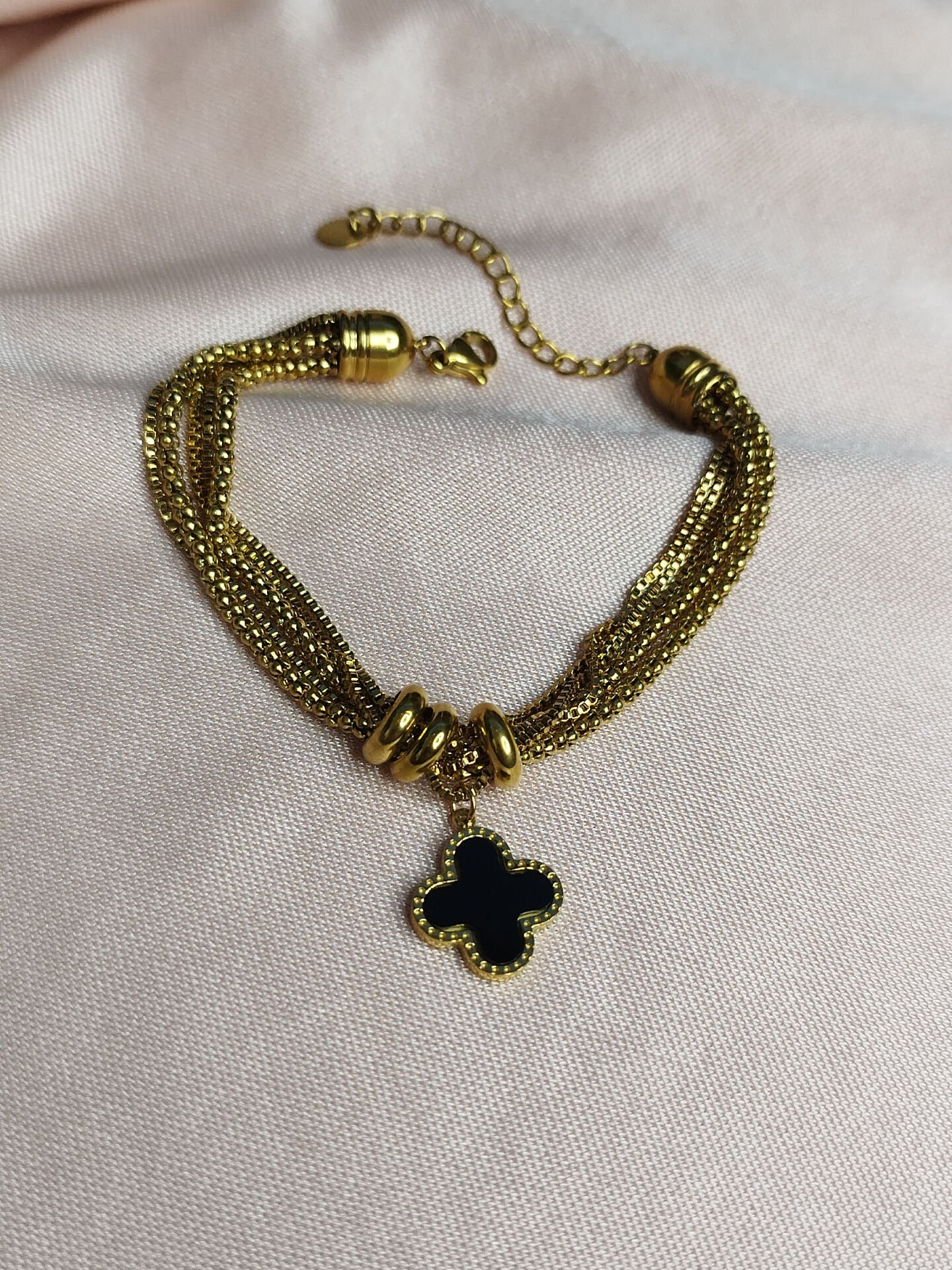 Siyah Yonca Detaylı Gold Çelik Bileklik